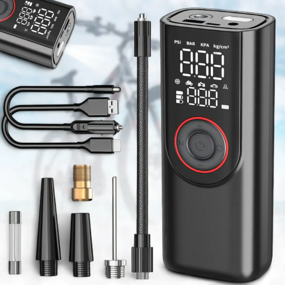 Портативний компресор ATJ-9566 —компактний і потужний пристрій для накачування шин автомобілів, мотоциклів, велосипедів, м'ячів та інших надувних виробів. Максимальний тиск до 150 PSI дозволяє швидко та ефективно відновлювати тиск. Вбудовані акумулятори ємністю 2000 mAh ×3 забезпечують автономну роботу до 30 хвилин, а потужність 80W дозволяє прискорити процес накачування. Компресор оснащений цифровим дисплеєм для точного контролю тискута LED-ліхтариком для використання у темряві. Пристрій також виконує функцію Powerbank, дозволяючи заряджати мобільні гаджети через USB-порт. До комплекту входять різні насадки для різних типів виробів.