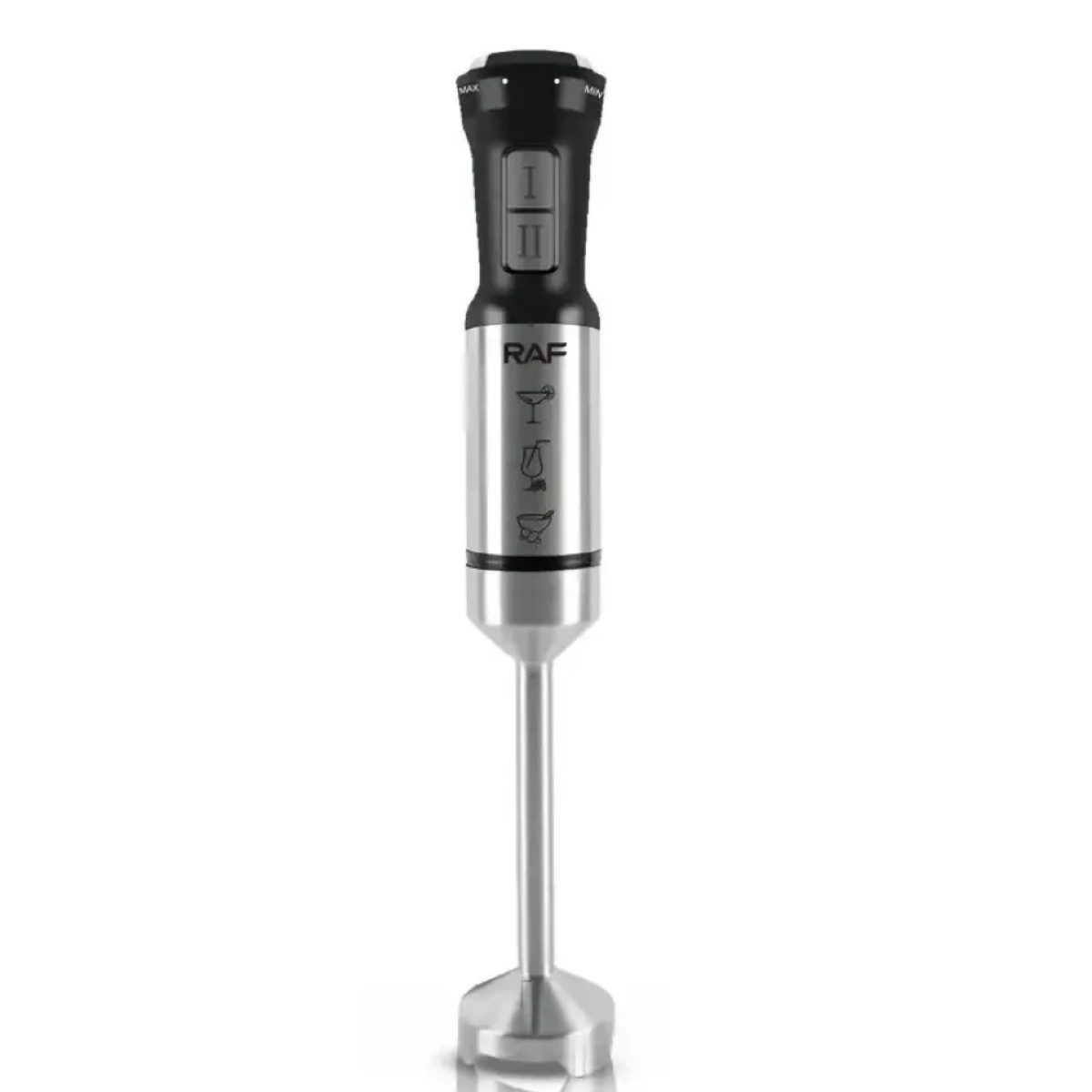 - На корпусі занурювального блендера RAF є дві кнопки. Перша відповідає за роботу на стандартній швидкості, друга кнопка виконує функцію «турбо» – короткочасне підвищення швидкості обертання насадок до максимального рівня. В результаті ми отримуємо більш ретельне змішування, збивання та подрібнення.