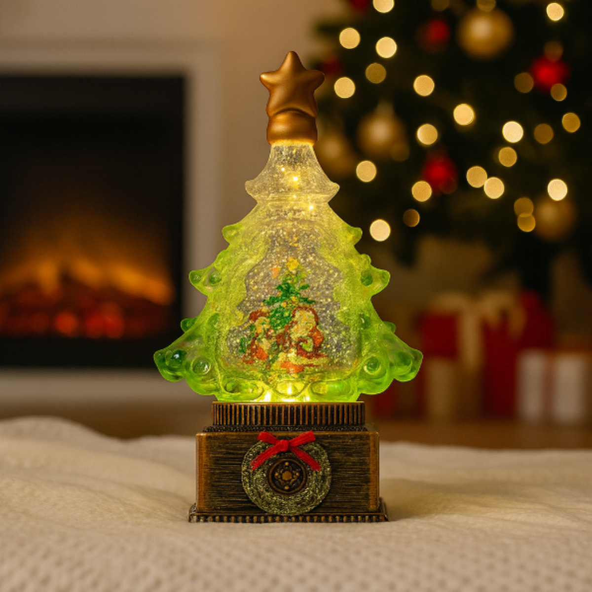 Поринте в атмосферу справжнього різдвяного дива з цим унікальним світильником-декором! Це не просто "сніговий куля", а ціла казкова композиція, виконана у вигляді прикрашеної ялинки на вінтажній бронзовій підставці. Всередині прозорої ялиночки прихована мініатюрна сцена: Санта-Клаус біля своєї ялинки. Але справжнє чаклунство починається при включенні: Вбудований механізм створює ефект "снігового вихору", і тисячі мерехтливих блискіток починають кружляти у воді, створюючи зачаровану заметіль. М'яке LED-підсвічування освітлює цю сцену зсередини, перетворюючи сувенір на чарівний нічник. Цей світильник стане центральним елементом вашого святкового декору або незабутнім подарунком для близьких.